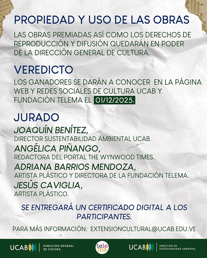 • Veredicto: El nombre de los ganadores se dará a conocer en la página web y redes sociales de la Dirección General de Cultura  UCAB y Fundación Telema el  1  de diciembre  de 2025.