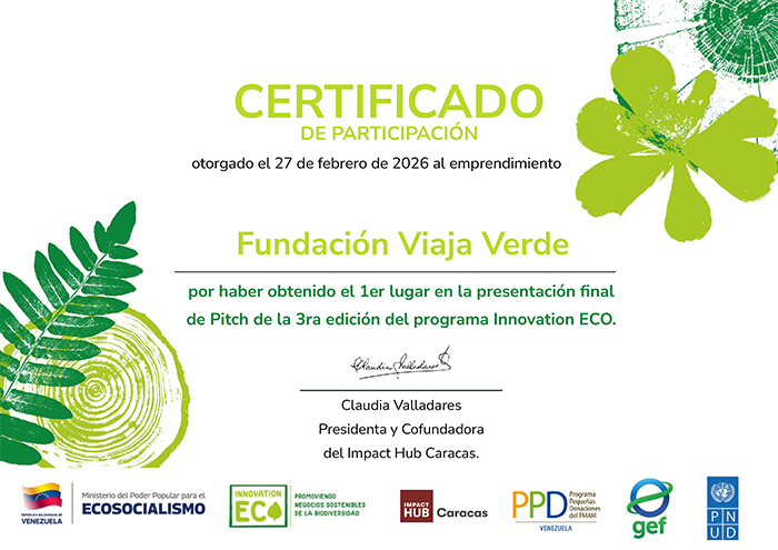 El programa, impulsado por el Programa de las Naciones Unidas para el Desarrollo (PNUD), el Fondo Mundial para el Medio Ambiente (GEF), el Programa de Pequeñas Donaciones (PPD), el Impact Hub Caracas y el Ministerio de Ecosocialismo (MINEC), seleccionó a la Fundación Viaja Verde entre una amplia gama de proyectos innovadores de sectores como el cacao, café, cambur, miel, turismo y productos agrobiológicos de todo el territorio nacional.