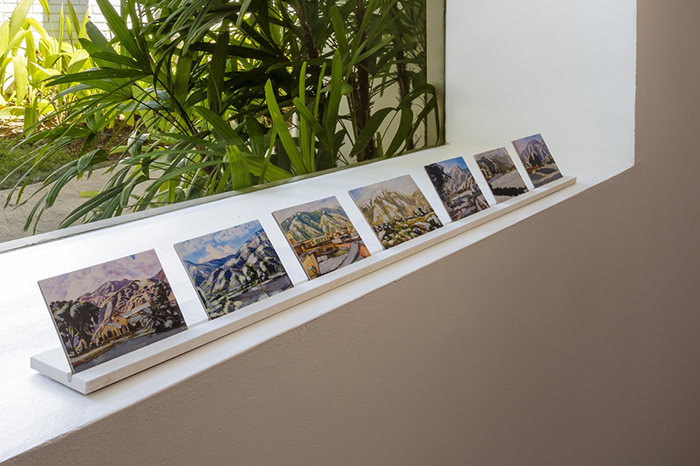 Nuestra plática abarcó diversos aspectos conceptuales e históricos de la cultura visual, especialmente los relacionados con las paradojas y dilemas de la representación artística. Durante nuestro diálogo Néstor abordó algunas de las nociones que articulan su trabajo como la relación de dominio entre imagen y realidad, el papel del soporte como contenedor simbólico y el paisaje como ámbito de confrontación entre el discurso hegemónico y la mirada decolonial. Su práctica se origina en el inventario de tipologías visuales y el análisis de las convenciones que determinan sus usos y sentidos.
