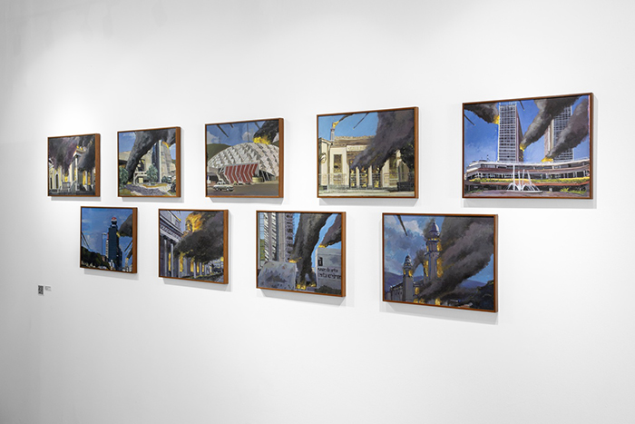 También está la segunda versión de «¿Es pintura la pintura?», articulada a partir de la reproducción de una serie de pinturas donde aparece el cerro de El Ávila de Caracas. A cada una de las reproducciones se les agregó con acrílico una serie de llamaradas y humo sobre el cerro que, además de sugerir “la aspiración ballenera de quemar el Ávila”, también plantea una reflexión sobre los efectos de auratización y capitalización simbólica que la intervención de la mano del pintor puede desarrollar sobre una imagen específica.