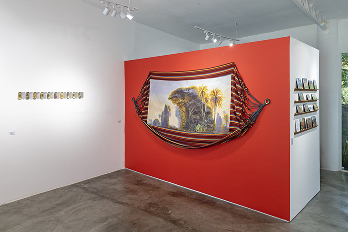Igualmente se incluye la serie “Recorridos que articulan relatos, capítulo: un atardecer en el río Manzanares de Cumaná de Bellerman”, constituida a partir de una serie de hamacas sobre las cuales se pinta un inventario de paisajes latinoamericanos ejecutados por artistas viajeros como Ferdinad Bellerman y Frans Post, entre otros, quienes generan un tipo de reconocimiento gráfico de nuestros territorios, desde una perspectiva exotizante que oblitera nuestras cosmogonías más ancestrales.