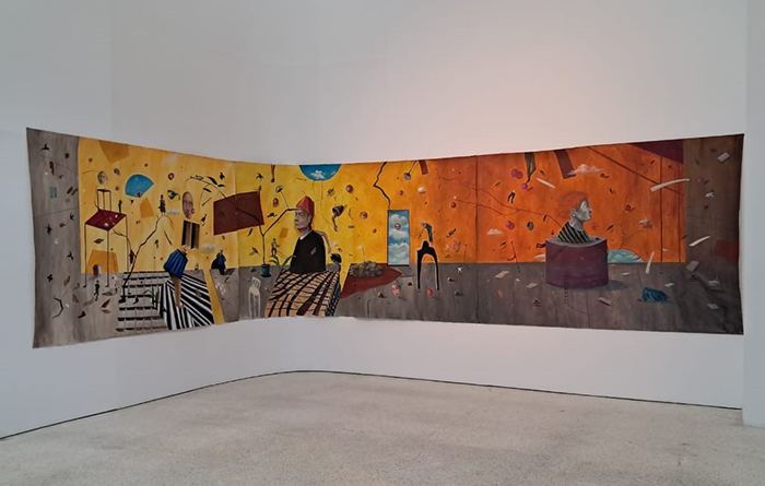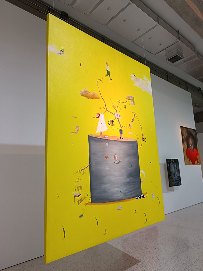 “Justamente este proyecto se planificó de esta forma, dada la importancia de exponer en la Galería de Arte Nacional para que la gran cantidad de público que asiste acá conociese un poco más este trabajo de forma histórica por etapas. Por eso hay obras desde el 2017 hasta la fecha para que se pueda observar esa evolución donde hay obras con un solo personaje y luego con el pasar el tiempo se fueron juntando mucho más en cada obra. En cada propuesta se nota una evidentemente transición, porque de hecho hay obras que a lo mejor tiene un tratamiento un poco más detallado, luego me permito más gestualidad, pero sin perder ese concepto propio dentro del mundo de los sueños y lo onírico, la fantasía y la imaginación de donde nacen los personajes de las obras.